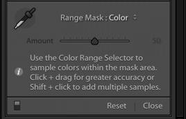 To use the color range mask, select your adjustment area with one of the local adjustment tools. To select the colours you want to work on, click and drag the area that represents those colours. You can also select specific colour areas with > shift+click on desired points.