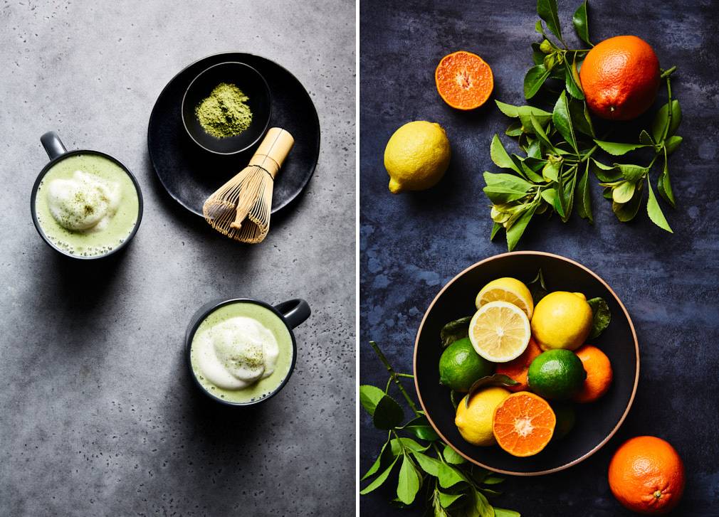 In the image of the matcha lattes on the left, the surface has just enough texture to create interest. The matcha whisk also adds some really nice to texture to the shot.