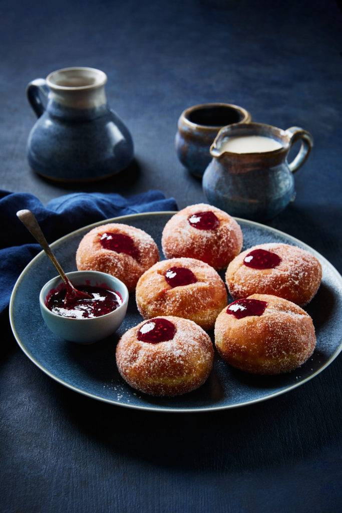In the shot of donuts below, the background and props have a subtle texture, as do the donuts because they are sprinkled with sugar—which adds texture to an otherwise smooth food subject. The linen is smooth and adds a layer of interest.