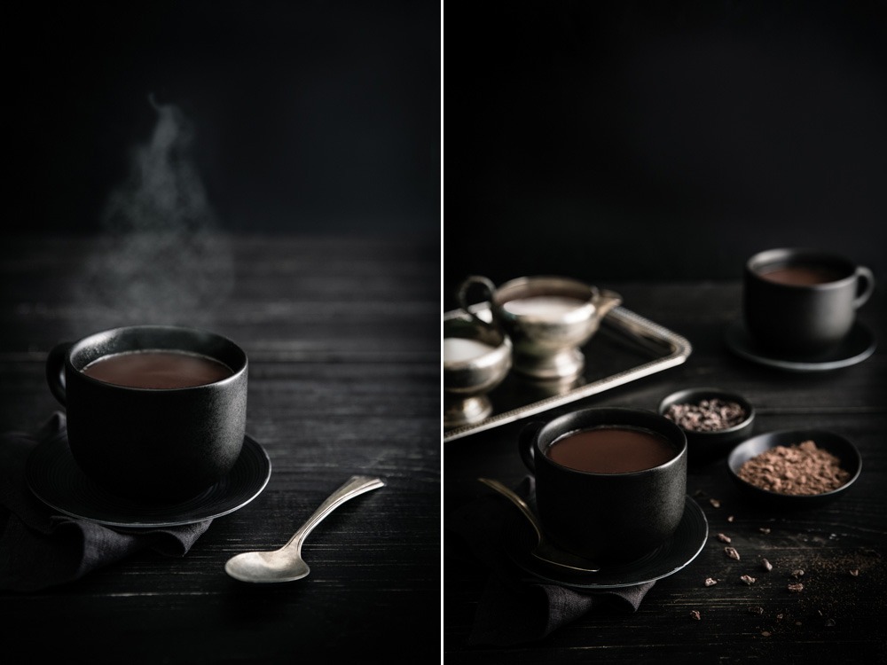 Hot chocolate tends to separate, so it’s best stirred and poured right before shooting. Marshmallows look good when added to the beverage while it’s hot. The edges will melt and look attractive.